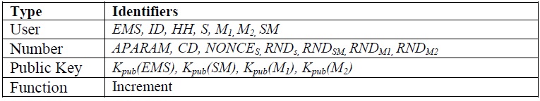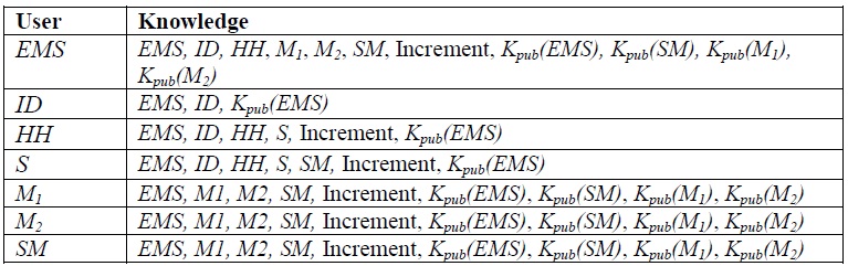 When a protocol execution initiates, each principal needs initial knowledge to compose its messages. The identifiers in user category need to have the knowledge of data it uses for its protocol execution. The Table 6, captures the knowledge of each user in our implementation.