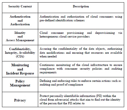 In [19] the authors propose a credential classification and a framework for analyzing and developing solutions for credential management that include strategies to evaluate the complexity of cloud ecosystems. This study identifies a set of categories relevant for authentication and authorization for the cloud focusing on infrastructural organization which include classifications for credentials, and adapt those categories to the cloud context. The study also summarizes important factors that need to be taken into consideration when adopting or developing a solution for authentication and authorization – for example, identifying the appropriate requirements, categories, services, deployment models, lifecycle, and entities. In other work, a design model for multi-factor authentication in cloud computing environments is proposed in [20], and this model includes an analysis of the potential security threats in the proposed model. Another authentication solution is seen with MiLAMob [21], which provides a SaaS authentication middleware for mobile consumers of IaaS cloud applications. MiLAMob is a middleware-layer that handles the real-time authentication events on behalf of consumer devices with minimal HTTP traffic. The middleware currently supports mobile consumption of data on IaaS clouds such as Amazon’s S3.