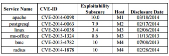 Each of the six vulnerabilities is unique and publicly known and is denoted by a CVE (Common Vulnerability and Exposure) identifier. For example Apache web-server was found to have CVE-2014-0098 on 03/18/2014 which allows remote attackers to cause segmentation faults. Similarly the postgresql service hosted by M2 had a vulnerability denoted by CVE-2014-0063 which allowed remote attackers to execute arbitrary code. Several public sites such as NVD (National Vulnerability Database), MITRE, Nessus provide information about wellknown vulnerabilities and also the severity of it using scores values adopted by the CVSS (Common Vulnerability Scoring System) framework.