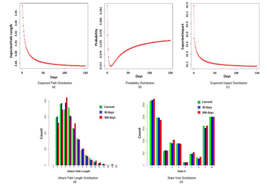 The Probability Path (PP) distribution (Fig 8b) which signifies the likelihood of an attacker compromising the security goal follows a different trend where it is seen reducing during the first few days and then picks up gradually with time. As vulnerabilities age, exploits become readily available for vulnerabilities which leads to an increase in their CVSS exploitability scores. As a result the transitions probabilities in the model will change likely causing other attack paths in the tree to become more favorable to the attacker. In the figure, we see that the probability of reaching the security goal tapers off after 50 days. The Expected Impact metric (Fig 8c) or cost of an attack to the business reduces with time and this is an indication that the attacker will likely choose a different path due to more exploits being available for other vulnerabilities that have a lower impact score. It is important to note that every organization has a network configuration that is very unique to their operations and therefore the distribution for our proposed attack graph metrics will be different for each of these configurations.