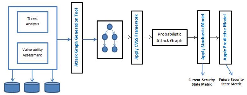 In this section, we explore the concept of modeling the Attack graph as a stochastic process. In [40, 41], we established the cyber-security analytics framework (Figure 3) where we have captured all the processes involved in building our security metric framework. By providing a single platform and using an open vulnerability scoring framework such as CVSS it is possible visualize the current as well as future security state of the network and optimize the necessary steps to harden the enterprise network from external threats. In this paper we will extend the model by taking into account the temporal aspects associated with the individual vulnerabilities. By capturing their interrelationship using Attack Graphs, we can predict how the total security of the network changes over time. The fundamental assumption we make in our model is that the time-parameter plays an important role in capturing the progression of the attack process. Markov model is one such modeling technique that has been widely used in a variety of areas such as system performance analysis and dependability analysis [11, 27, 42-43]. While formulating the stochastic model, we need to take into account the behavior of the attacker. In this paper, we assume that the attacker will choose the vulnerability that maximizes his or her probability of succeeding in compromising the security goal.