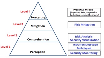 This proposed research falls in the realm of “Cyber Situational Awareness” which provides a holistic approach to understanding threats and vulnerabilities. There are multiple levels to Situational Awareness as depicted in Figure 1. Situational awareness is a universal concept and is the ability to identify, comprehend and forecast the integral features of a system. Situational awareness was defined by [3] as “the perception of the elements in the environment with a volume of time and space, the comprehension of their meaning, and the projection of their status in the near future”.