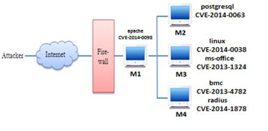 The network is comprised of 4 machines that are interconnected together and operating internally behind a firewall. The Attacker or threat is outside the firewall and is connected to an external network which has access to this firewall. The firewall has only one port open (port 80) to the outside network for access to its web-server. The machine hosting the web-server M1 is running Apache Webserver. The aim of the attacker is to infiltrate the network and gain root access on M4. In order to accomplish this, the attacker needs to first start with the apache web service since that is the only port (80) accessible from the firewall