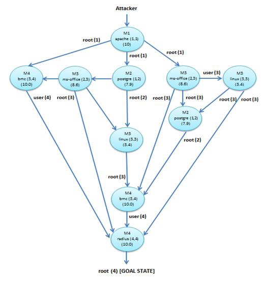 An attack graph is an abstract representation of the different scenarios and paths an attacker may use compromise the security of a system by using multiple vulnerabilities. It is a very effective tool for security and risk analysis as it takes into account the relationships between multiple vulnerabilities. Computer attacks have been graphically modeled since the late 1980s by the US DoD as discussed in their paper [16]. Most of the attack modeling performed by analysts was constructed by hand and hence it was a tedious and error-prone process especially if the number of nodes were very large. In 1994 Dacier et al [17] published one of the earliest mathematical models for a security system based on privilege graphs. By the late 1990’s a couple of other papers [18, 19] came out which enabled automatic generation of attack graphs using computer aided tools. In [18] the authors describes a method of modeling network risks based on an attack graph where each node in the graph represented an attack state and the edges represented a transition or a change of state caused by an action of the attacker. Since then researchers have proposed a variety of graph-based algorithms to generate attack graphs for security evaluation.