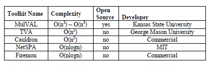 By combining the vulnerabilities present in the network configuration (Figure 7), we can build several scenarios whereby an attacker can reach a goal state. In this particular case, the attacker’s goal state would be to obtain root access on Machine M4. Figure 5 depicts the different paths an attacker can take to reach the goal state. By combining these different paths we are able to obtain an Attack Graph. A couple of practical approaches have been proposed [44- 46] to automate generation of attack graphs without the intervention of a red team. In [47] the authors have compared and analyzed several open source AG tools like MulVal, TVA, Attack Graph Toolkit, NetSPA as well as commercial tools from aspects of scalability and degree of attack graph visualization. Table 2 provides an overview of the different available AG toolkits.