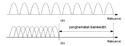 Multicarrier modulation is defined as modulation technique in which there are several subcarrier or frequency to modulate the separate signal and every subcarrier is orthogonal each other. This mechanism is also called OFDM (Orthogonal Frequency Division Multiplexing). By this nature the signal in every subcarrier can be overlapped without Intercarrier Interference (ICI). This mechanism can save bandwitdh needs [9]. Spectrum illustration between conventional FDM and multicarrier (OFDM) is shown at figure 5.