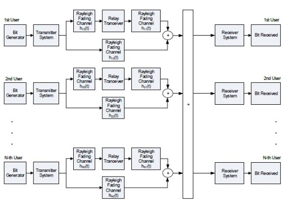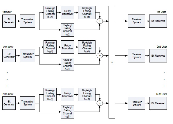 Figure 15 shows the model of multi user scheme in multi hop communication with one relay. The multi user model assumes that the communication is in uplink mode, therefore 1 st user until Nth user will generate the random bit and each information will be modulated and transmitted passing the different fading channel to the relay and directly to the receiver. The transmitted signal from every user will pass three fading channels. One signal will be transmitted directly to the receiver, and the second signal will be transmitted to the relay via second fading channel, and after received by relay the signal will be received and forward to be transmitted passing the third channel to receiver. The signal in receiver will be acummulated from all users in which every user sends two signal because there are two hops from every users. In the receiver the system will separate the signal from different user by multi user detector using MC CDMA / MC DS CDMA despreading and integrator. The performance of multi user will be calculated from one of the user in the receiver system.