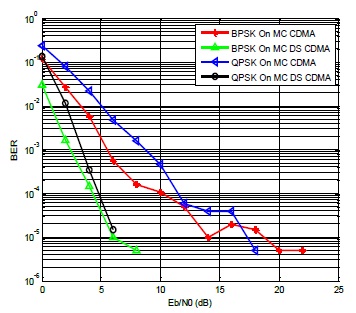 The simulation result is displayed at figure 16. From the figure it can be concluded that absolutely Marray PSK with the higher Marray will have the worse performance. For MC CDMA in order to reach BER 10-4 QPSK needs additional power about 2 dB, while for MC DS CDMA QPSK needs additional power about 1 dB. And overall MC DS CDMA has better performance than MC CDMA. In order to reach BER 10-3 at QPSK MC CDMA needs additional power about 5 dB, while at BPSK MC CDMA needs additional power about 3 dB.