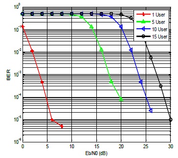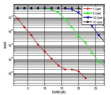 The simulation result is displayed at figure 18 and figure 19. For multi user cases the result of simulation performs similar tendency. At MC CDMA simulation system with 5 users will need much power about 17 dB than 1 user to reach BER 10-3 . But for 10 users active, system will need only 6 dB than 5 users. The increase of the active user will increase the needs of power but on decreasing power need tendency. As well as the MC CDMA, MC DS CDMA performs similar result. System with 5 users active needs additional power 14 dB rather than 1 user. And system with 10 users active needs 6,5 dB rather than 5 users active.