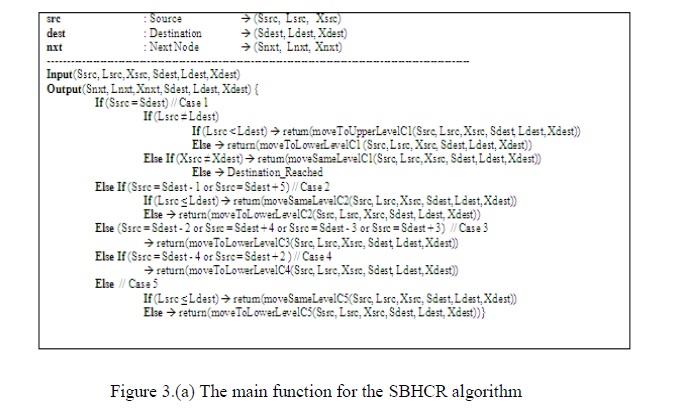 As an input to this routing algorithm the address of the source node (which is the first node address) and the address of the destination node (Ssrc, Lsrc, Xsrc, Sdest, Ldest, Xdest) is used to get the output which is the address of the second node and the address of the destination node (Snxt, Lnxt, Xnxt, Sdest, Ldest, Xdest). Then the second node apply the routing algorithm using the address of the source node (which is the second node address in this case) and the address of the destination node (Ssrc, Lsrc, Xsrc, Sdest, Ldest, Xdest) to get the address of the third node and the address of the destination node (Snxt, Lnxt, Xnxt, Sdest, Ldest, Xdest). We continue this way until we reach the source address equal the destination address.