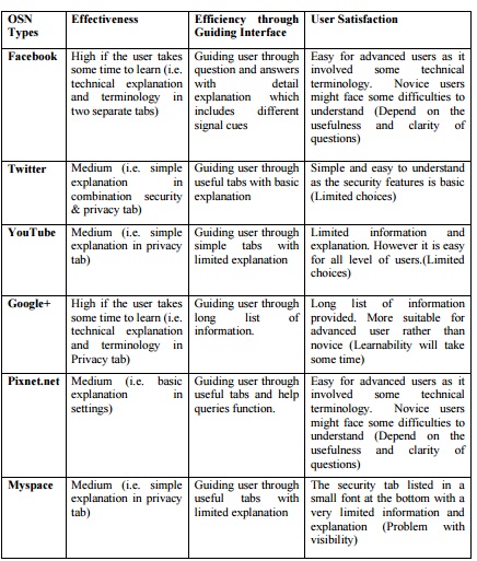 Usability can be viewed as a quality attribute that evaluates how user interface is being used [12]. Thus, in order to deliver the information and meet the purpose of one particular system, the end-results of application must be user-friendly and be presented with a correct Human Computer Interaction (HCI) aspects. Many HCI guidelines have been implemented to guide the developers to provide a meaningful manner and understanding system functionality (i.e. interface, security features, etc) [13, 14, 15, 16]. At present, there are not very much focus has been given to improve the usable security of Online Social Network (OSN). As the social networking quickly become popular means of communication, there are corresponding needs to ensure that end-user would be competent and easy to interact and to use the application. However, for this current work, the authors make an early observation to compare six types of Online Social Network (OSN) in respective of usability as a template filled with useful template data in a general sense as shown in Table 1. It is expected that the developers able to re-asses this template to fill in with more detail and concrete data via fully implementation of usability evaluation methods which also become our future works.