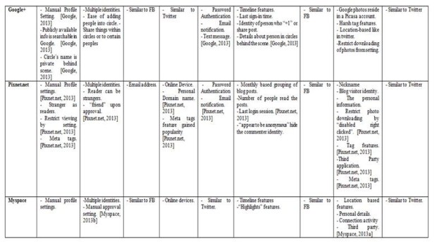 Next, Facebook, Google +, Myspace and Twitter has inhibit location based features affecting data privacy. Twitter and Google + can affect the data privacy with the Harsh Tag features [23, 24] and YouTube affect data privacy with the freely downloadable and sharing video features [26]. Pixnet. Net can harm data privacy through Meta tags as the tags helped to promote their blog entries to the public with common tags [25]. Besides that, one‟s online status can be easily shown even he “Appear to be Offline”, because of the “Seen” features, affecting user privacy. Facebook, Twitter, YouTube, Google Plus, Pixnet. net and Myspace reveals user‟s data such as current profile picture, cover photo and account name to the public by default, affecting both user privacy and data privacy.