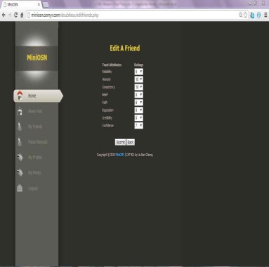 MiniOSN is developed using PHP programming language and hosted in miniosn.comyr.com, as a free web site. By using miniOSN, users can view a list of his/her friends and edit the friendship accordingly. As illustrated in Figure 5, the user can specify the trust towards his/her friend. The user can rate each of the connected friends differently according to the trust between them based on the eight trust traits, namely honesty, reliability, reputation, credibility, confidence, competency, faith and belief. The rating is made by default zero value, and is range from 1-10. The larger the number, the higher the rating it is