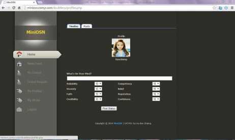 MiniOSN enables users to post a status and a photo. Figure 5. shows the timeline of the user profile if the user clicks “My Profile”. User is able to post a status under “What‟s On Your Mind?” At the same time, the user can set the weight of each trust traits accordingly in order to adjust the accessibility of the post he/ she want to share.