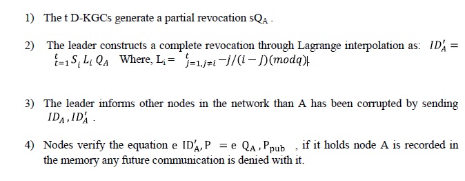 Key revocation is the process by which compromised node is removed from the network without effecting the working of network. Suppose a node A is detected abnormal in the network then any t of n D-KGCs jointly execute key revocation process against the node A in the following way