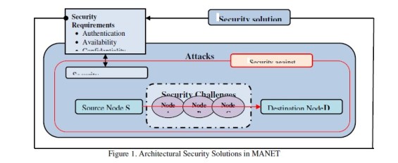 From figure 1, it is noticed that any connection between two nodes is made in a coherent communication is done through another node. During contact some challenges are encountered which is a sign of weakness in the level of protection, and this helps to give opportunities for attackers of MANET whether from the outside or from the inside. Solutions must be found to protect MANET network based on the security requirements and security mechanism in order to reduce and avoid the challenges, and this leads to reduce and avoid attacks. Hence we strengthen and raise the level of protection by a strong security wall against attacks. In this architecture each component affects the other components.