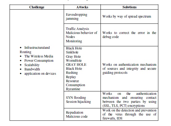 The security mechanism in MANET requires security solutions so as to build a security wall to protect MANET against risks and attacks that may be exposed to it. The attacks occur when security is weak which results in the challenges which stand in the development of security solutions. The challenges must be investigated and avoided in order to provide a safe environment devoid of threats and attacks. In this study some of the security solutions are suggested in table 2.