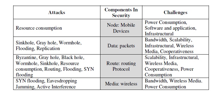 Table 3.The Link between the Components, Challenges and Attacks in MANET