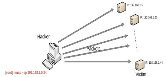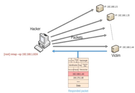 Going back to the case study of password guessing attack described previously, in the first objective of S which is DTT, the hacker sends threat objective packets to block of IP addresses to determine which host is alive. Identifying the exact IP address to target requires from the victim to reply to the hacker. The following figure illustrates how hackers identify which system to target.