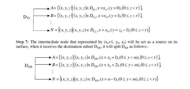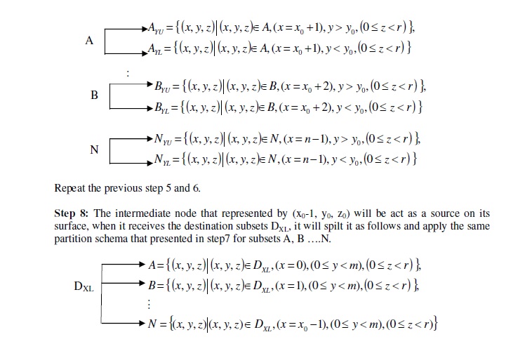 Step 6: The intermediate node that represented by (x0, y0-1, z0) will be act as a source on its surface, when it receives the destination subset DYL, it will spilt it as follows and apply the same partition schema that presented in step5 for subsets A, B ….N.