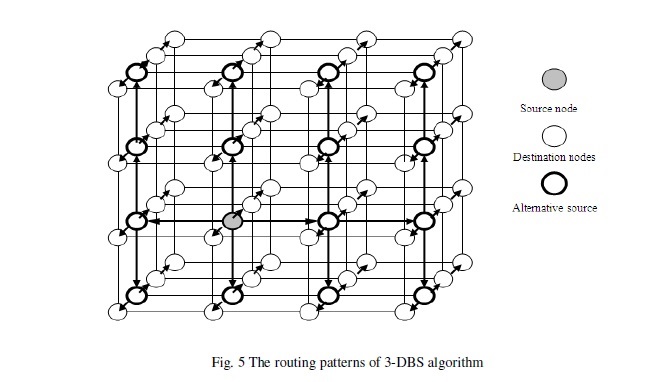 The source repeats this partition strategy for DXR and DXL. The routing pattern of 3-DBS algorithm is shown with bold lines in Fig. 5.