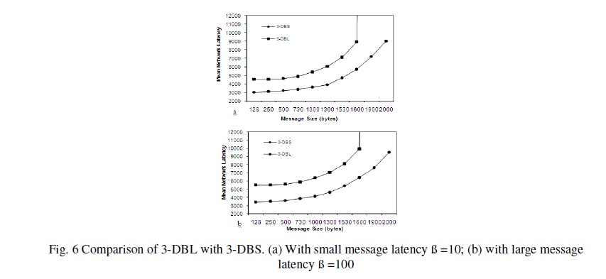 We examined the routing performance of our proposed algorithms under various, startup latencies ß, and message lengths. The message length is the number of flits in a message and the message startup latency includes the software overhead for buffers allocating, messages coping, router initializing, etc. The maximum latencies were measured and then averaged over these samples. Figure 6 compares the two algorithms across different message lengths (100 bytes to 2000 bytes) in 5 x 5 x 5 network. In Fig 6(a), the startup latency ß is set to 10 microseconds. In Fig 6(b), the startup latency ß is set to 100 microseconds. In both cases, the advantage of the 3-DBS algorithm is significant. The 3-DBS algorithm is less sensitive rather than the 3-DBL algorithm, however, the disadvantage of 3-DBL algorithm increases with the message lengths.