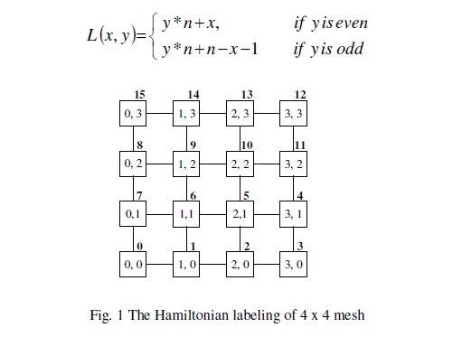 Hamiltonian paths: A network partitioning strategy based on Hamiltonian paths is fundamental to the deadlock-free routing schemes. A Hamiltonian path visits every node in a graph exactly once [31]; a 2-D mesh has many Hamiltonian paths. In this algorithm, each node u in a multicomputer is assigned a label, L (u). In a network with N nodes, Hamiltonian path assigns a label for each node based on the position of that node in a mesh, where the first node in the path is labeled 0 and the last node in the path is labeled N −1. Fig. 1 shows such a labeling in a 4 x 4 mesh. The label assignment function L for an m x n mesh can be expressed in terms of the x−, y − coordinates of nodes as follows: