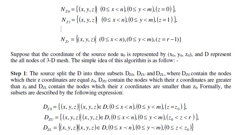 Step 5: The alternative source (x0, y0, zDZU1) will sends the message to all nodes in DZU1 using Hamilton model of 2-D mesh, the alternative source (x0, y0, zDZU2) will sends the message to all nodes in DZU2 using Hamilton model of 2-D mesh and so on. Step 6: Divide DZL into n subsets, DZL1, DZL2, ……….. DZLN. Formally, the subsets are described by