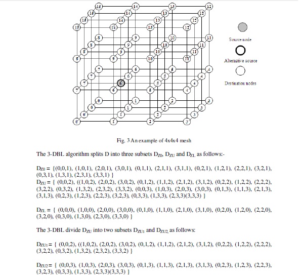 To demonstrate the performance of 3-DBS algorithm, consider the example shown in Fig. 5 for a 4 x 4 x 4 mesh topology. The source node with integer coordinate (1, 1, 1) initiates a broadcast to all D nodes in the 3-D mesh. The source dive the D into the following:-