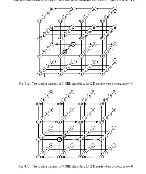 The routing pattern of 3-DBL algorithm is shown with bold and dashed lines in Fig. 4(a) for 2-D mesh where z coordinate =1, in Fig. 4(b) for 2-D mesh where z coordinate =2, in Fig. 4(c) for 2-D mesh where z coordinate =3 and in Fig. 4(d) for 2-D mesh where z coordinate =0.