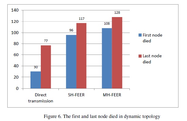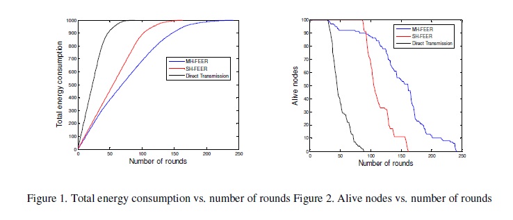 From the simulation result shown in figure 2 and 3, we can see that the first node dies in directtransmission algorithm after 30 rounds while in SH-FEER and MH-FEER first node dies after 87and 31 rounds respectively. We also observe that the last node dies in direct transmissionalgorithm after 89 rounds while in SH-FEER and MH-FEER last node dies after 162 and 241rounds respectively. Therefore, in this set of simulations, we note that MH-FEER about 32.78 %more efficient in term of network lifetime compared to SH-FEER and about 63.07 % than thedirect transmission algorithm.Furthermore, the number of alive nodes decreases speedily with direct transmission and SHFEERcases in comparing to the MH-FEER algorithm.
