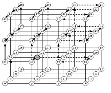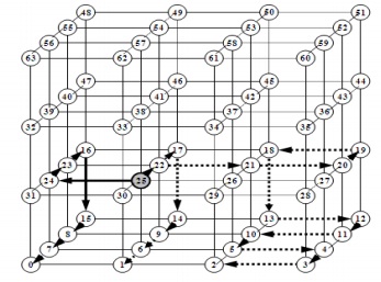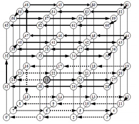 To study and compare the performance of 3-DHB and 3-DSPHB algorithms, consider the example shown in Fig. 4 for a 4 x 4 x 4 mesh topology labeling using a Hamiltonian path. Thesource node with Hamilton labeled 25 which has an integer coordinate (1, 1, 1) will send abroadcast to all nodes in its 3-D mesh multicomputer.