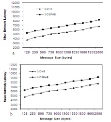 Figure 8 compares the two algorithms across different message lengths (100 bytes to 2000 bytes) in 5 x 5 x 5 network. In Fig 8(a), the startup latency ß is set to 10 microseconds. In Fig 8(b), the startup latency ß is set to 100 microseconds. In both cases, the advantage of the 3-DHB algorithm is significant. In the 3-DHB when the broadcast size increases, the number of message-passing steps required to complete the broadcast operation is not increase, so 3-DHB algorithm is significant. The source node in n 3-DHB algorithm will send two messages only from its two external channels. Since communication latency in wormhole-routed broadcast systems is dependent on the length of the message, average latencies of 3-DSPHB algorithm linearly increase as the length of the message as shown in Figure 8.