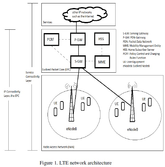 The LTE network architecture can be divided into two main parts: the Radio Access Network (RAN), and the Evolved Packet Core (EPC) as in Figure 1. The RAN consists of an Evolved NodeB (eNodeB) and User Equipment (UE). The eNodeB is the connection point for the UE with the core network. It hosts the PHYsical (PHY), Medium Access Control (MAC), Radio Link Control (RLC), and Packet Data Control Protocol (PDCP) layers that include the functionality of user-plane header-compression and encryption. It also offers Radio Resource Control (RRC) functionality that corresponds to the control plane. Scheduling, admission control, and radio resource management are also performed in the eNodeB. The EPC part consists of five main components: the Policy Control and Charging Rules Function (PCRF), the Home Subscriber Server (HSS), the PDN-Gateway (P-GW), the Serving Gateway (S-GW), and the Mobility Management Entity (MME). The PCRF is a logical node that is responsible for policy control decision-making, and controlling the flow-based charging functionalities in the Policy Control Enforcement Function (PCEF) which is being hosted at the P-GW. It also decides how a certain data flow will be treated in the PCEF by providing the QoS authorization, QoS class identification, and determine the bit rates in accordance with the user’s subscription profile. TheHSS is the database of the LTE network, it contains all the users’ subscription QoS profile, information about the Packet Data Networks (PDNs) in-which the user can connect to, dynamic information that relates the identity of the MME to which the user is currently attached or registered to, and it may also integrate the Authentication Center (AuC) that generates the vectors for authentication and security keys. The P-GW is the gateway which is responsible for QoS enforcement for Guaranteed Bit Rate (GBR) bearers, flow-based charging according to rules from the PCRF, and the allocation of IP addresses to users. In addition it filters user’s IP packets into different QoS-based bearers based on Traffic Flow Templates (TFTs). It also serves as the mobility anchor for inter-working with non-3GPP networks such as WiMAX and WiFi. The SGW is the gateway that serves as the local mobility anchor for the data bearers while users are moving between eNodeBs, in which all their IP packets are transferred through it. It temporarily buffers user’s downlink data when it is in the idle state, while the MME initiates paging of the UE to re-establish the bearers. It performs administrative functions in the visited network such as collecting information for charging and legal interception. It also serves as the mobility anchor for inter-working with 3GPP networks such as General Packet Radio Service (GPRS) and Universal Mobile Telecommunication Systems (UMTS). The MME is the main node in the EPC, it manages the Authentication and Security, the subscription profile and service connectivity of users. It is responsible for all the mobility management tasks such as inter eNodeBs handovers, inter MMEs handovers, and it keeps a track of the location of all users [6].