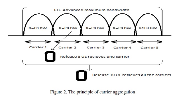 The 3GPP Release 8/9 supports at max 20 MHz channel bandwidth for a carrier. The issue of supporting more bandwidth for a carrier seems to be a straight forward solution to support more data rate. Hence the concept of carrier aggregation was introduced where multiple carriers of 20 MHz (or less) would be aggregated for the same UE. Figure 2 shows the principle of carrier