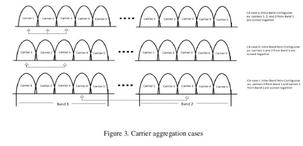 Carrier aggregation in the downlink and uplink are entirely independent as long as the number of uplink carriers cannot exceed the number of downlink carriers. Each aggregated carrier is called a Component Carrier (CC). 3GPP defined three types of allocation that meets different operator’s spectrum scenarios: Intra-band contiguous, Intra and Inter-band non-contiguous as Figure 3