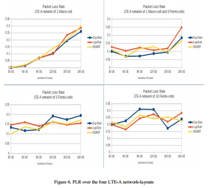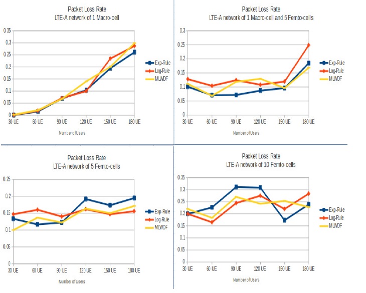 Packet Loss Rate (PLR) is measured by dividing the difference between the total transmitted and received packets for all users over the total transmitted packets. The Packet Loss Rate over the four LTE-A network-layouts are displayed in Figure 6. According to the obtained results that are displayed in the upper right of Figure 6, offloading 50% of the macro-cell’s traffic to five femto-cells affected the PLR values in a way that it fluctuated between 0.06 and 0.13 until the number of users reached 150 UE, it then started to increase, because the system started to reach its maximum throughput. At this serving scenario’s conditions, the use of the Exp-Rule is a good choice in terms of PLR values with increasing the number of users. The Log-Rule showed the highest PLR, especially when the number of users exceeded 150 UE.