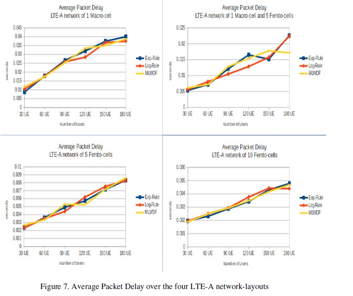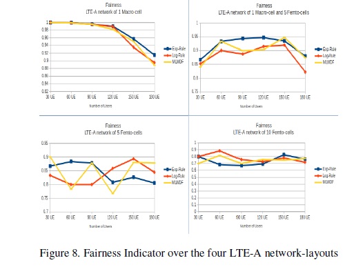 Where rk denotes the throughput of user k. The Jain’s fairness index for the three scheduling algorithms over the four LTE-A networklayoutsare displayed in Figure 8.