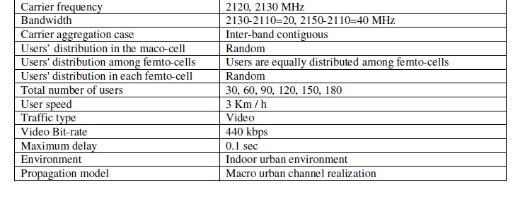 Long Term Evolution (LTE), LTE-Advanced (LTE-A), Carrier Aggregation (CA), Intra-band contiguous, Heterogeneous Networks (HetNets), Femto-cells, Quality of Service (QoS), Exponential Rule (Exp-Rule), Logarithmic Rule (Log-Rule), Modified Largest Weighted Delay First (MLWDF), LTE-Sim-5.