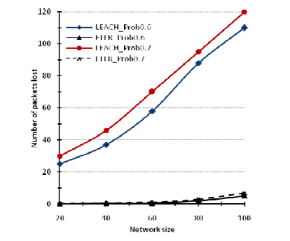Figure 2 shows the variation of the number of packets lost according to the network size for various values of probability of successful reception. We observe that the number of lost packets increases when this probability increases. These obtained results mean that the performance of LEACH degrades in a realistic environment thereby the original version of this protocol is not adaptable for non-ideal environment.