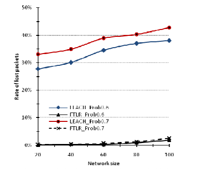 Figure 5 proves the efficiency of our contribution such as the ratio of lost packets is also almost negligible, it attains the reliability required. Therefore, our contribution would provide a sufficient trade-off between guaranteeing the transmission reliability and achieving fault-tolerance of communication links. Hence, based on these results, FTLR can outperform the original version of LEACH and it can be applied in realistic environment