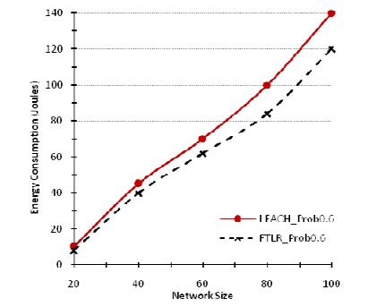 Since energy consumption is one of the major concerns in WSNs, we evaluated the energy consumption and compared it between FTLR and the original version of LEACH. We assumed that if the probability of reception without errors is less than a predefined threshold the cluster member generates a random number whose value is between 0 and 1, and if this number is higher than 0.5, it will perform a retransmission of the packet; otherwise the packet will be dropped. In this context, the energy consumption is calculated according to the energy model [21 ] which considers that the energy consumed for transmitting and receiving of one bit using MICA2 sensor model is respectively 4.602 µJ and 2.34 µJ