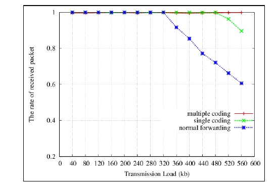 In addition to test each strategy flow average delay along with the change of bandwidth, we also did a survey about packet receiving rate with the change of transmission load in three forwarding strategy.