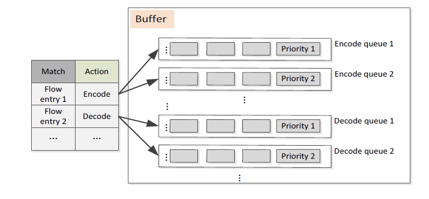 Another method for reducing time delay is optimizing the buffer management. First, we make the openflow switch store the packets respectively by dividing the buffer into encoding queue and decoding queue. Second, the openflow swtich extract the coding information brought by the packets from buffer and put the information into linked lists. Then the switch could match the packet through the linked lists directly. By this method, the search complexity is simplified and computation is reduced.