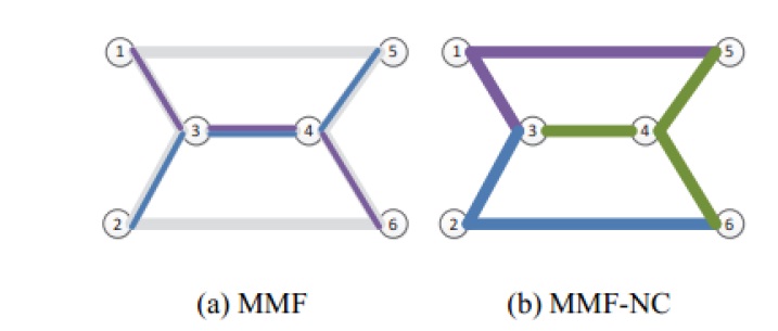 Figure 2 :In a butterfly structured topology of 6 nodes, one flow is generated from node 1 to node 6 in purple, and the other is from node 2 to node 5 in blue. The encoded flow is in green. (a)With MMF algorithm, the link(3,4)is the bottleneck; (b)with MMF-NC algorithm, the bottleneck doesn’t exist