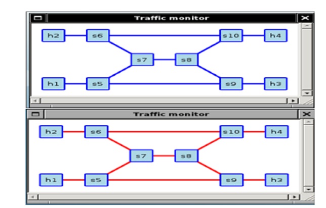 We test NC-OF on Mininet, one of the popular network simulation platforms. In order to observe the data flow transmission process, we design a traffic monitor in Mininet . When no flow in the network, the line between switches is displayed as blue, and when there are flows, the line is displayed as red, as shown in Figure 7.