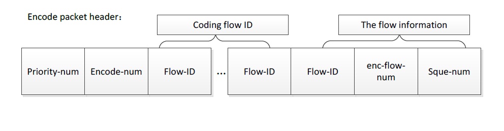 In the OpenFlow protocol, it allows to add MPLS label to packet header, so we use this flexible field to transmit corresponding coding information within the coding packets. We send the NC metadata in MPLS labels following the format showed in Figure 3 and Figure 4. The Figure 3 is the encoding packet header and the Figure 3 is the decoding packet header. They all include the flow ID and the corresponding sequence number. In order to reduce the additional transmission, there is only one flow that carries the coding information among all the coding flows. And the coding strategy was transmitted through NCOF, which is similarly with OpenFlow Channel.