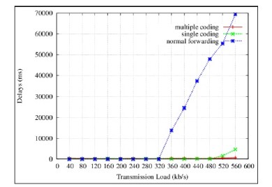 The experimental results as shown in Figure 10, in normal forwarding ,when the transmission load is greater than 320kb/s, the average delay of flows showed a substantial upward trend,mainly due to the port transmission rate is less than the reception rate of the switch. So the link between s10 and s11, s11 and s12, s12 and s13 become congestion. Similarly, when the transmission load exceeded 480kb/s in single coding , it also appears link congestion lead to time delay. While multiple coding improved the link capacity through coding several times has not