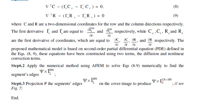 An Irregular image segmentation functionAFEM IIS c has been applied to improve steganographic security; this function is based on (ARSE) to reallocate segments’ edges; where the segments’ edges have been calculated by solving the suggested two-dimensional partial differential equation PDE on a sorted image z I , which is created from cover-image. The proposed algorithm has been summarized in the following steps: