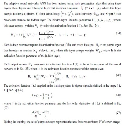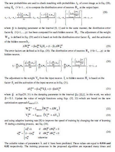 We proposed the intelligent technique; based on hybrid adaptive neural networks with a modified ant colony optimizer (ANN_MACO), see Fig. 8. In this work, ANN and MACO represented the third safety layer; this layer is introduced to support and the enhanced steganography algorithms by constructing an excellent imperceptible of S I and working effectively against statistical and visual attacks. The proposed intelligent technique ANN_MACO includes (n-p-m) Perceptron layers’ architecture; it has (n) neurons in input layer, (p) neurons in the hidden layer and (m) neurons in the output layer with full connections.